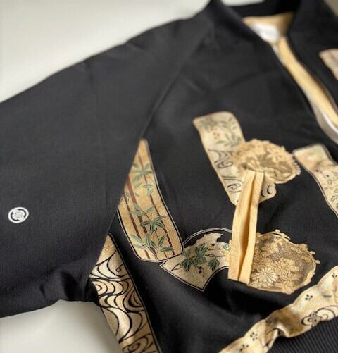 格式のある黒留袖には、のし文様と華やかな金箔が大胆に施され