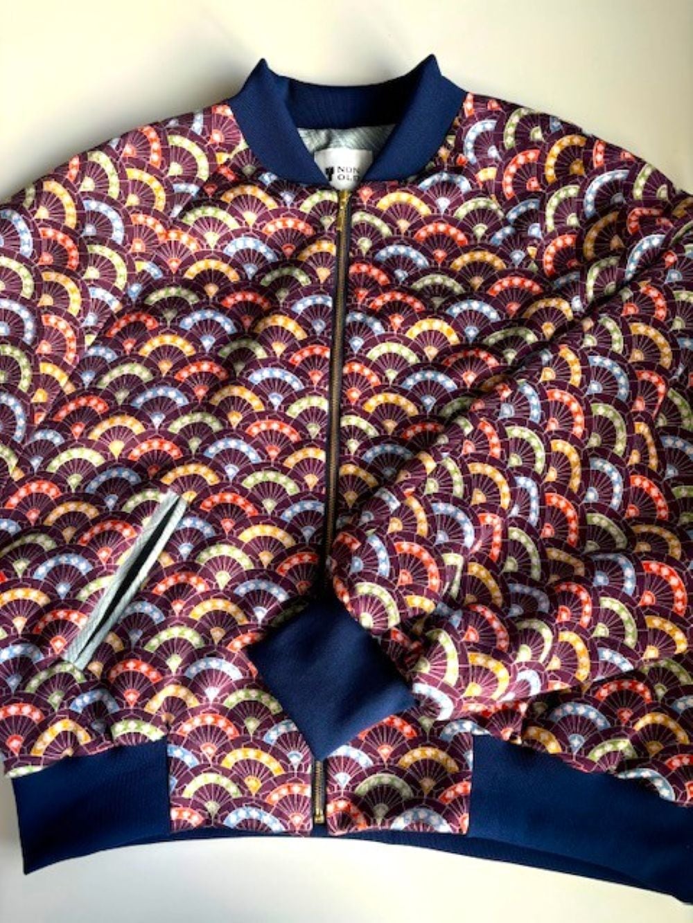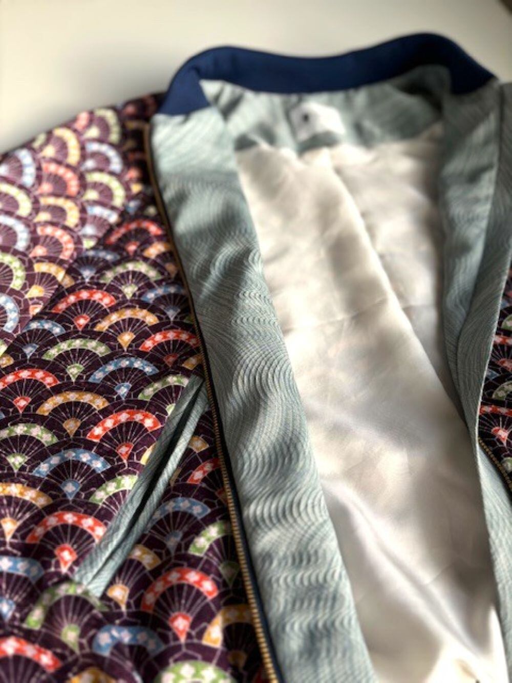 ポケットやファスナー部分には、水色のKIMONO布と